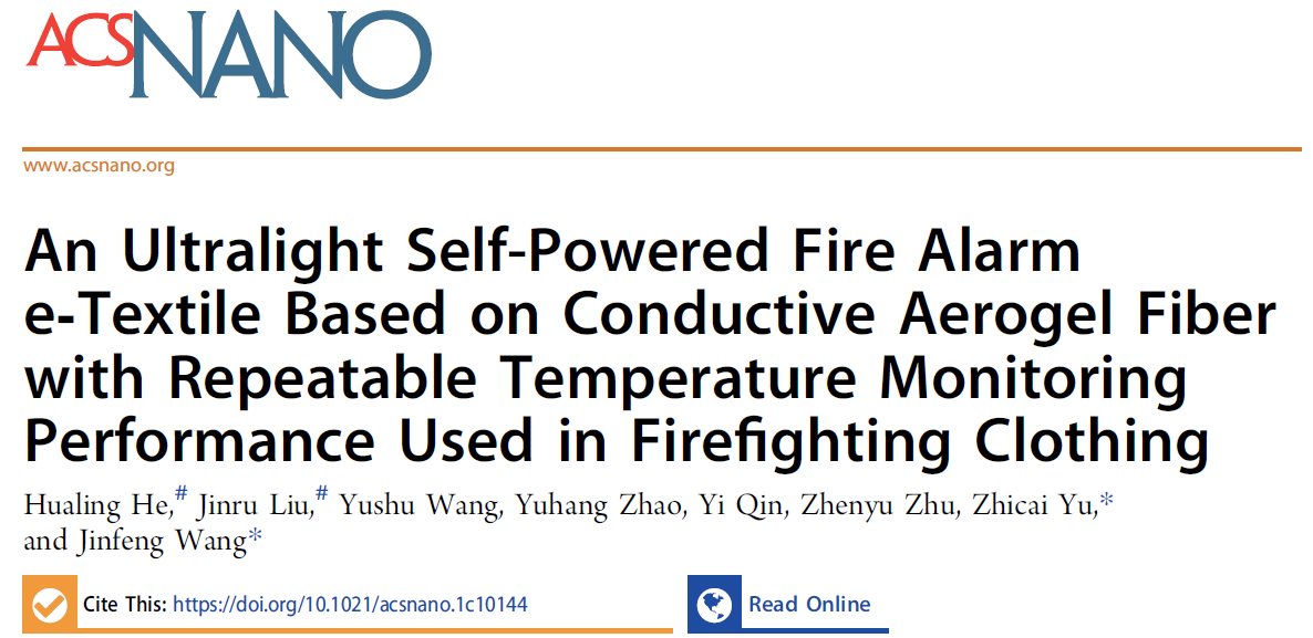 1月27日,纳米材料领域国际顶级期刊《美国化学学会:纳米》(ACS NANO,影响因子15.881)在线发表伟德bv国际体育王金凤教授团队在智能火灾预警气凝胶纤维方面取得的重要进展—"An Ultralight Self-Powered Fire Alarme-Textile Based on Conductive Aerogel Fiber with Repeatable Temperature MonitoringPerformance Used in Firefighting Clothing”,文章DOI:https://doi.org/10.1021/acsnano.1c10144。伟德bv国际体育为该文章唯一署名单位,通讯作者为于志财副教授与王金凤教授,伟德bv国际体育化学与化工学院轻化工程系专任教师何华玲博士与2019级纺织科学与工程硕士研究生刘金如为文章共同第一作者。