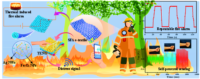 消防服是消防救援行动中的重要防护装备,消防服的功能性研究成为相关领域的前沿,王金凤教授团队的研究为消防服装提供实时火灾温度监测以及高效能量采集功能。该研究基于摩擦纳米发电机(FT-TENG)机理,结合气凝胶纤维的轻质,可编织性及半导体纳米材料的温度响应电阻变化特征,制备出一种兼具超灵敏温度响应与自供电能力的电子织物。将该电子织物与消防服用面料结合,当消防服表面遭受350℃以上高温火焰时可实现即时预警,也可用作消防服的能量收集器,为消防员提供自供电定位及个人营救功能。该项研究得到纺织新材料与先进加工技术伟德bv国际体育、先进纺纱织造及清洁生产国家地方联合工程实验室及生物质纤维与生态染整湖北省重点实验室的大力支持。