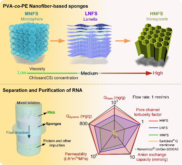 构筑纳米纤维三维块体层析材料是解决环境敏感型生物大分子药物(如RNA)分离纯化难、分离纯化效率低问题的有效方法。然而,纳米纤维三维块体材料目前主要是通过冷冻干燥的方式获得,由于冷冻过程冰晶的形态难以调控,导致多孔通道结构与孔道壁表面的化学活性难以协同优化,已经成为阻碍纳米纤维层析材料制备的一大难题。课题组提出了一种通过改变壳聚糖等功能聚合物含量,用于调控纳米纤维悬浮液的粘度,再经过冷冻干燥获得孔道结构可调的PVA-co-PE纳米纤维海绵材料的新方法。通过控制纳米纤维分散液的粘度,制备了具有微球结构(MNFS)、片层结构(LNFS)和蜂窝结构(HNFS)的纳米纤维海绵。对三种结构进行了综合性性能分析,发现蜂窝结构材料中纳米纤维与化学交联剂之间的化学反应,促成了具有复合材料特征的孔道壁,从而产生了最好的水下压缩性能和形状记忆性能。该材料的渗透率达到7.431×103L h m2psi-1,对RNA的静态饱和吸附容量887.6 mg g−1和动态饱和吸附容量763.2 mg g−1,都远超现有报道的层析材料性能。