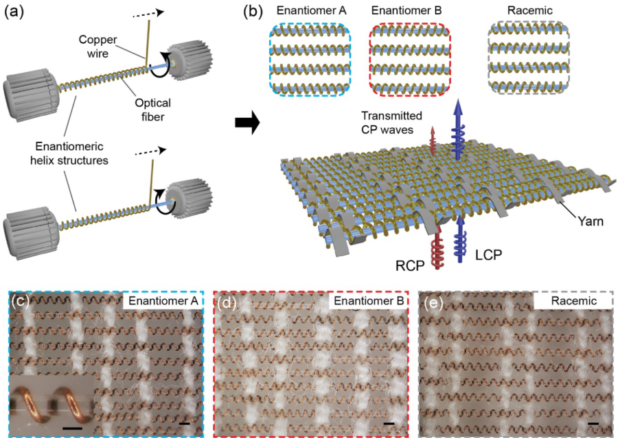 研究团队提出了一种新型复合编织式太赫兹手性光电子器件。首先,用绕线机将金属铜丝(直径约为60微米)沿剥离外包层的裸光纤(直径约为140微米)绕制,形成具有微米级螺距的螺旋结构作为构成人工超构材料的基本单元结构。该螺旋结构同时作为后续纺织工艺的纬线。进而,利用传统纺织技术以涤纶线为经线将制备好的人工单元结构纬线编织成超构材料样品。在本项工作中,利用两步纺织制造方法实现了大面积具有微米特征尺寸的超构材料样品制备,并且制备出的器件在太赫兹波段表现出强手性选择性和显著光学活性。更重要的是,本项目打破传统太赫兹超构材料需要复杂光刻工艺来制备的禁锢,是一次利用低成本的传统纺织技术突破电磁超构材料研究领域高制备成本的成功尝试。以此工作为基础,后续通过建立新型纺织制备技术与人工电磁超构材料之间的联系,实现从幅值、相位以及极化等多自由度对电磁波的灵活操控。该项工作体现出的先进设计理念给超构材料的发展开辟了新的思路,并展现了基于织物的超构材料在实现集成式微纳米光电子件方面的巨大潜力。