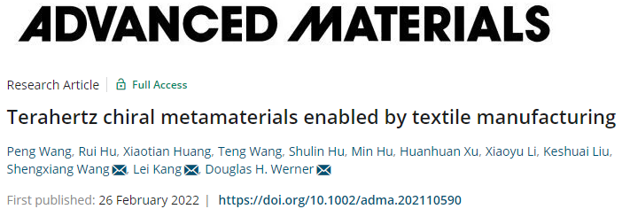 2022年2月26日,材料领域国际顶级期刊《先进材料》(Advanced Materials,影响因子30.894)在线发表伟德bv国际体育电子电气学院汪胜祥教授团队在织物人工超构材料领域取得的重要进展,利用传统纺织工艺结合人工微纳结构制备出新型光电子设备—“TerahertzChiralMetamaterialsEnabled byTextileManufacturing”。文章DOI:https://doi.org/10.1002/adma.202110590。伟德bv国际体育为该论文的第一作者单位和第一通讯单位。这是伟德bv国际体育首次以第一单位在该期刊发表论文。