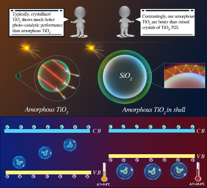TiO2的结构主要包含结晶型和无定型两种。其中,结晶型TiO2(金红石和锐钛矿)在光激发下呈现出较高的催化活性,但工业制备复杂,排放废弃物多,晶型转变需长时高温(>500oC)煅烧,能耗高。相比结晶型TiO2,无定形TiO2由于结构缺陷导致催化活性差,但制备能耗低且工艺简单。根据经典物理学理论,大多数半导体的禁带宽度与温度呈现负相关性,即禁带宽度随温度升高而下降。因此,作者首次充分利用太阳能转化为热能,通过简单改性使无定形TiO2形成类似“鸡蛋”保温结构的SiO2@TiO2核壳催化剂,利用光热转换效率实现对禁带宽度的调控,从而在室温可见光下具有高催化活性。