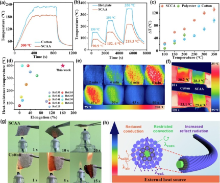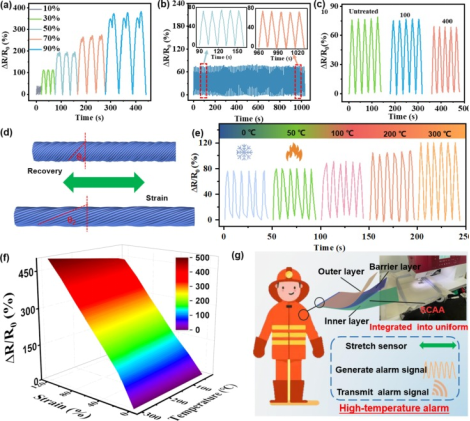 所得的纱线传感器具有独特的高伸长率(拉伸率高达160 %)、出色的隔热性(|Δ T|在350 °C时为131°C)和较宽泛的使用温度(0-300 °C),解决了电子纺织品在高温下拉伸性差的问题(图2)。高温下令人满意的应变传感性能和出色的热传感性能使其可以通过主动(拉伸)和被动(热传感)模式传输高温警报信号。可拉伸耐高温纱线的开发代表了高温传感纺织品的突破,为可穿戴纺织品提供了新的设计思路。