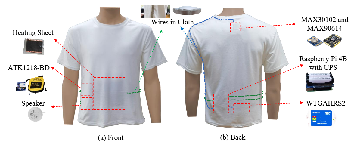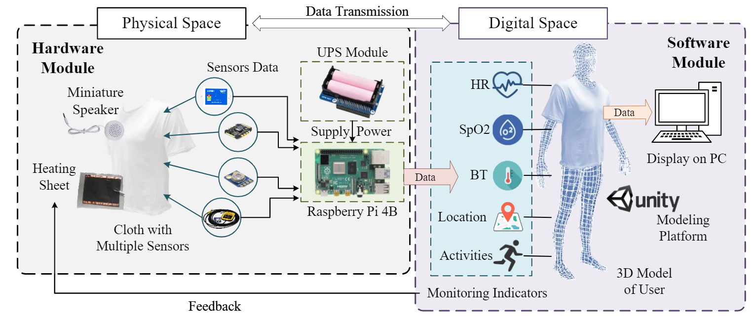该论文构建了一种由多种传感器构建的智慧服装系统。该系统包含心率、血氧饱和度、体温、定位和加速度等多模态传感器。同时采用团队提出的基于多模态传感器信息的生理状态和行为识别算法进行人体状态识别。最后采用数字孪生技术,将人体状态信息与人体三维模型实时映射,实现现实世界中的人体状态与虚拟三维空间中人体模型状态同步显示。这种新型的智慧服装系统实现了智慧服装系统的智能交互功能,并首次将数字孪生技术应用于智能可穿戴设备,为智慧服装的发展方向和产业应用提供了新思路。