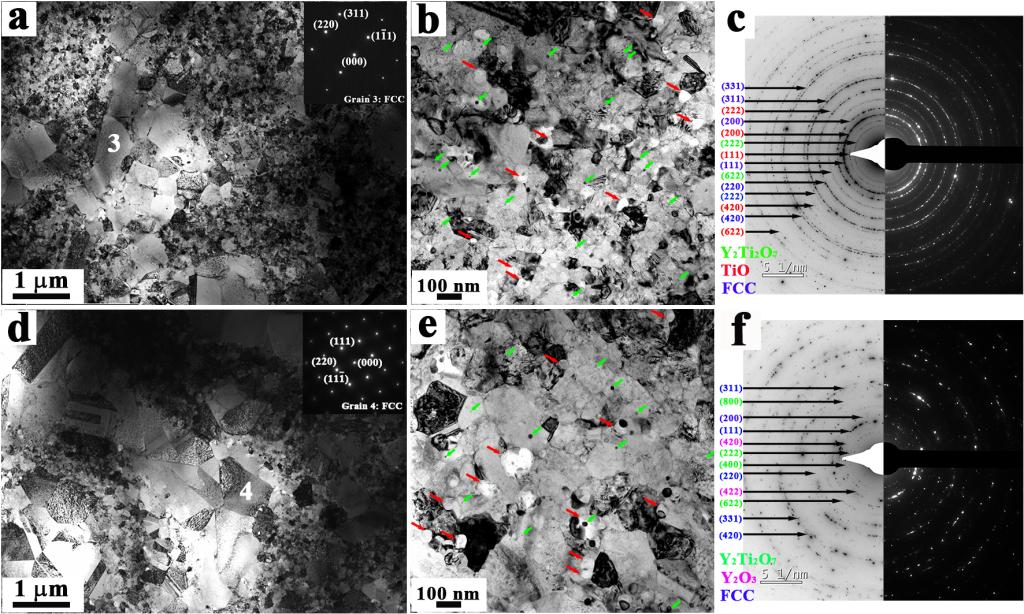 图1 T-1.05Y、T-1.75Y高熵合金显示双尺度晶粒分布和弥散氧化物的TEM照片