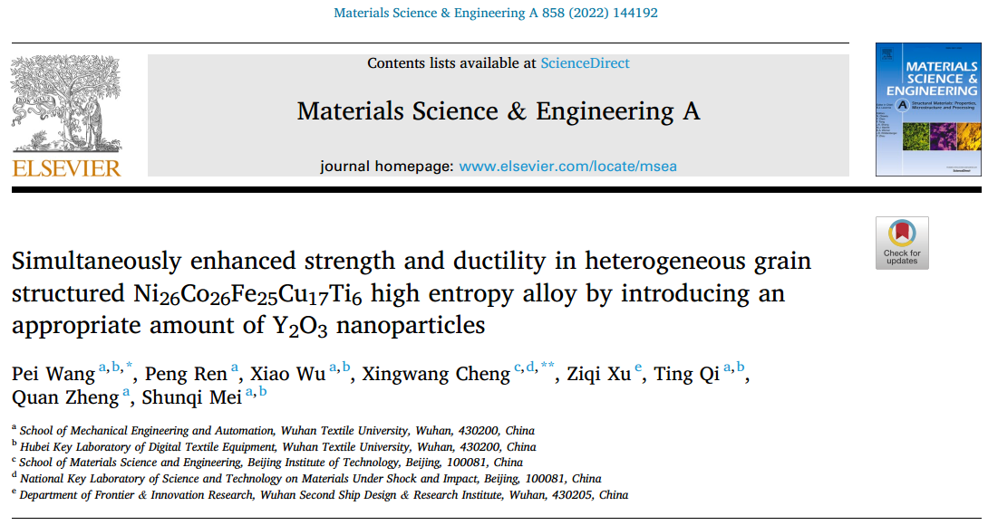 近日,伟德bv国际体育机械学院青年教师汪佩博士在高熵合金微结构设计强韧化方面取得了重要的研究进展。相关成果以题“Simultaneously enhanced strength and ductility in heterogeneous grain structured Ni26Co26Fe25Cu17Ti6 high entropy alloy by introducing an appropriate amount of Y2O3 nanoparticles”发表在材料科学领域一区Top期刊《Materials Science & Engineering A》上。该论文的第一单位为伟德bv国际体育,第一作者为机械学院汪佩。