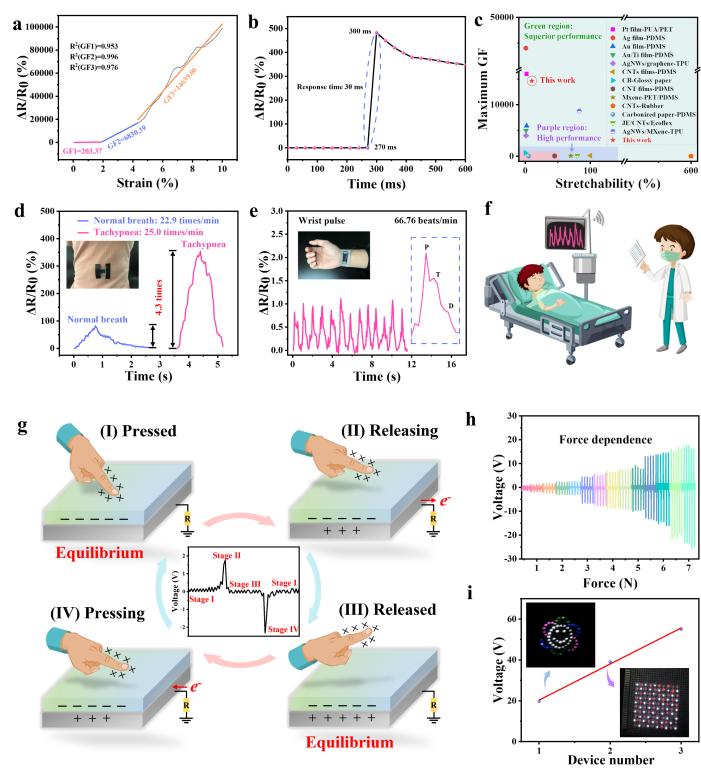 图2.(a-f)多功能丝瓜络柔性传感器的性能及应用;(g-i)多功能丝瓜络柔性传感器的TENG电输出性能