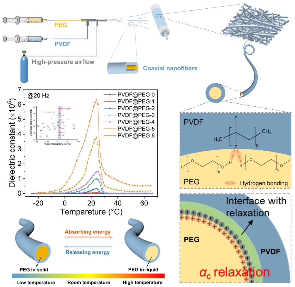 随着智能电子/电气系统的快速发展,对热敏介电材料的需求日益迫切。虽然不同类型和结构的热响应介电材料不断被报道,但它们的介电响应行为都源于热力学相变。在本研究中,姜明团队证明了聚偏二氟乙烯(Poly(vinylidene fluoride), PVDF)中的结构弛豫,一种非热力学相变,可以在室温下诱导产生显著的热响应介电脉冲。通过连续吹塑纺丝工艺制造的聚乙二醇(polyethylene glycol, PEG)-PVDF同轴纳米纤维膜(PVDF@PEG)可以在24°C下实现高达6.3×105的介电脉冲强度(20 Hz)。此外,该纤维膜表现出优异的柔韧性、可调的强度和韧性、可切换的亲水/疏水性以及有效的热管理能力。弛豫诱导介电脉冲效应、突出的多功能性和简单、连续、安全的制备相结合,促进了PVDF@PEG复合纤维的可扩展性和应用前景。特别是弛豫诱导介电响应机制的发现,为热响应介电材料设计和制备提供了一种新的策略。