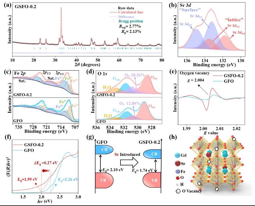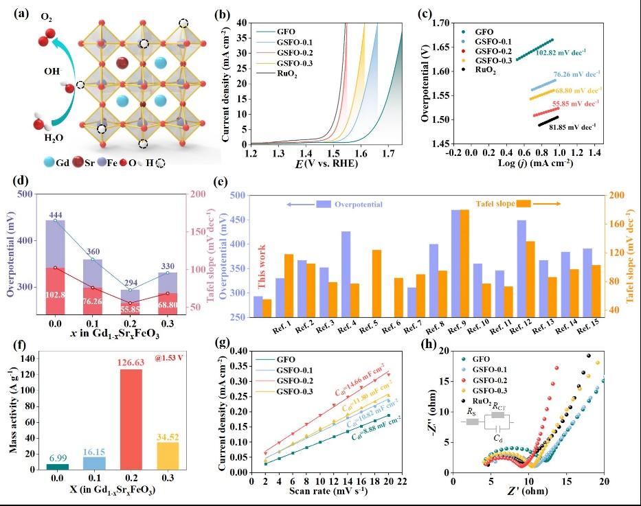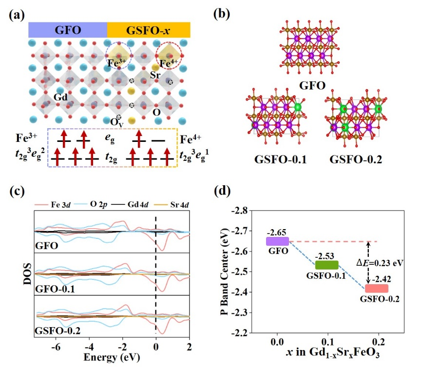 在GdFeO3的论文研究中,如图1所示,通过DFT理论计算预测,部分A位Sr替代可调节GdFeO3的电子构型,提高O 2p能带中心,从而显著降低氧空位的形成能,大幅提高其本征催化活性。