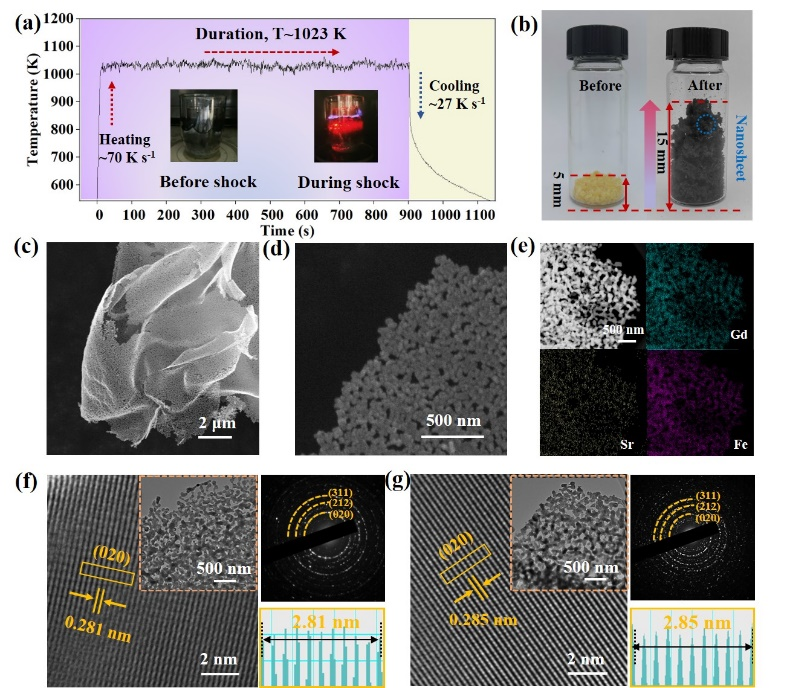 基于该预测,利用微波热冲法的瞬态温变特性(温度~1100 K,速率~70 K s-1),可实现Sr在GdFeO3晶体结构中的精确引入(图2)。同时还能一步实现二维多孔结构的构筑。