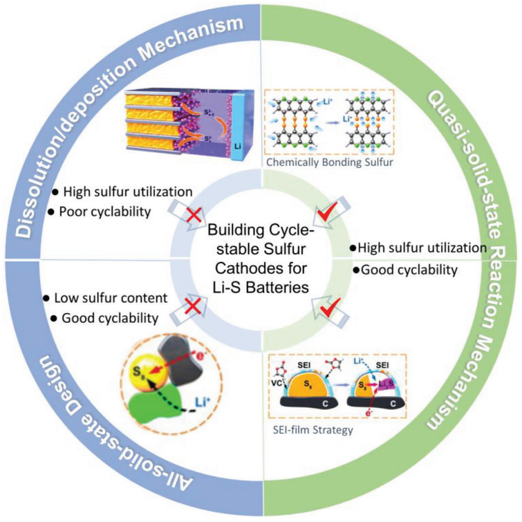 针对现有的Li-S电池的能量密度和循环性能难以实现商业化等问题,李惠博士与武汉大学的艾新平教授等人提出了实用Li-S电池开发电化学稳定的硫阴极的途径,从机理上分析了文献中提出的看似有效的策略为何却无法实施,以及如何为实用Li-S电池构建电化学稳定的硫阴极。为实现这一点,从多孔电极极化理论的角度分析了传统硫阴极固有的溶解/沉积机制问题,讨论了为实际可行的Li-S电池构建电化学稳定的硫阴极的可能策略。相关成果以“Routes to Electrochemically Stable Sulfur Cathodes for Practical Li-S Batteries”为题,发表在国际顶级期刊《Advanced Materials》上。