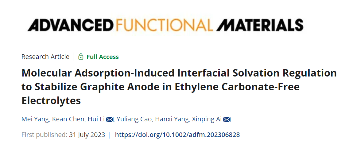 此外,陈嵘教授团队李惠博士和武汉大学艾新平教授等还提出了一种新策略来解决石墨阳极与碳酸丙烯酯(PC)基电解质电化学不兼容的问题,即引入表面吸附分子层来调节界面溶剂化结构,而不改变电解质的成分和性质。作为概念验证研究,研究首次证明了通过引入吸附六氟苯(HFB)分子层来削弱Li+-PC配位强度并促进界面去溶剂化过程,本质上不兼容的碳酸丙烯酯(PC)基电解质变得与石墨阳极完全兼容。因此,使用仅含1 Vol.% HFB的PC基电解液的石墨/NCM811软包电池在1150个循环周期内表现出了出色的长期循环稳定性。事实证明,这种策略也适用于其他不含碳酸乙烯(EC)的电解质,从而为开发先进的LIB电解质提供了一条新途径。相关成果以“Molecular Adsorption-Induced Interfacial Solvation Regulation to Stabilize Graphite Anode in Ethylene Carbonate-Free Electrolytes”为题,发表在国际顶级期刊《Advanced Functional Materials》上。