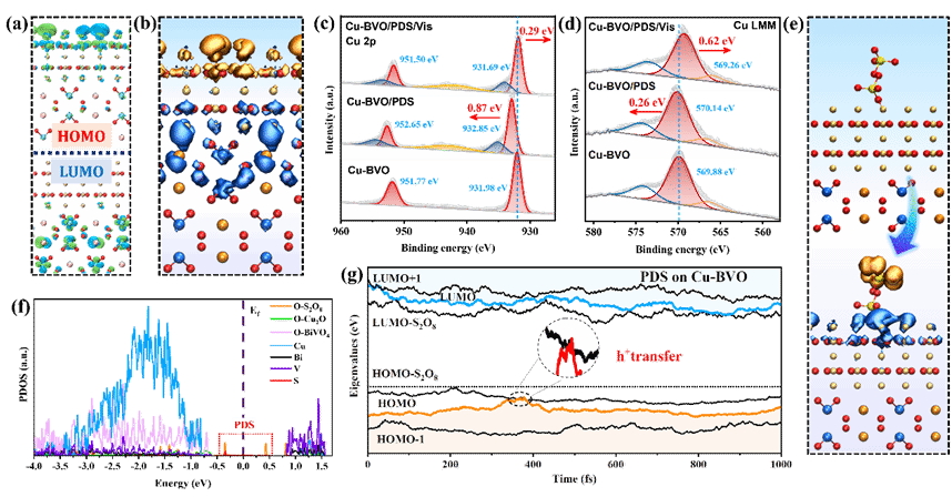 针对以上问题,本研究开发了一种具有高活性的Cu2O/BiVO4(Cu-BVO)异质结构,通过调节光“开-关”状态控制PDS与Cu-BVO之间的电子流向,从而实现了PDS在自由基途径和非自由基途径的可控转变。在黑暗条件下,Cu-BVO作为电子供体,通过单电子途径激发PDS中O-O键裂解,生成•OH和•O2-。Cu-BVO中激发电子和空穴的动力学行为分析表明,光激发后载流子在Cu-BVO中的定向迁移导致Cu2O表面形成缺电子区,从而促进亚稳态Cu-BVO-PDS的生成,这些活性中间体通过非自由基途径直接降解有机污染物。