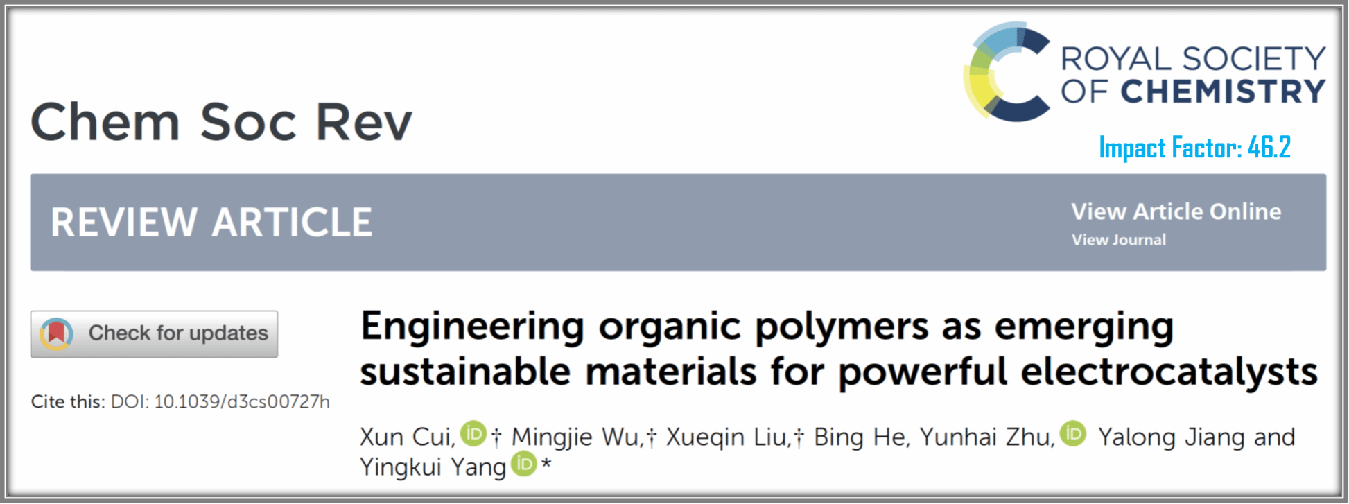 Chemical Society Reviews由英国皇家化学会(Royal Society of Chemistry)创刊于1972年,是世界化学、化工以及材料学科领域公认的最具影响力和权威性的三大综述性学术期刊之一,其发表的论文对相关领域的发展具有重要的引领作用和指导意义。