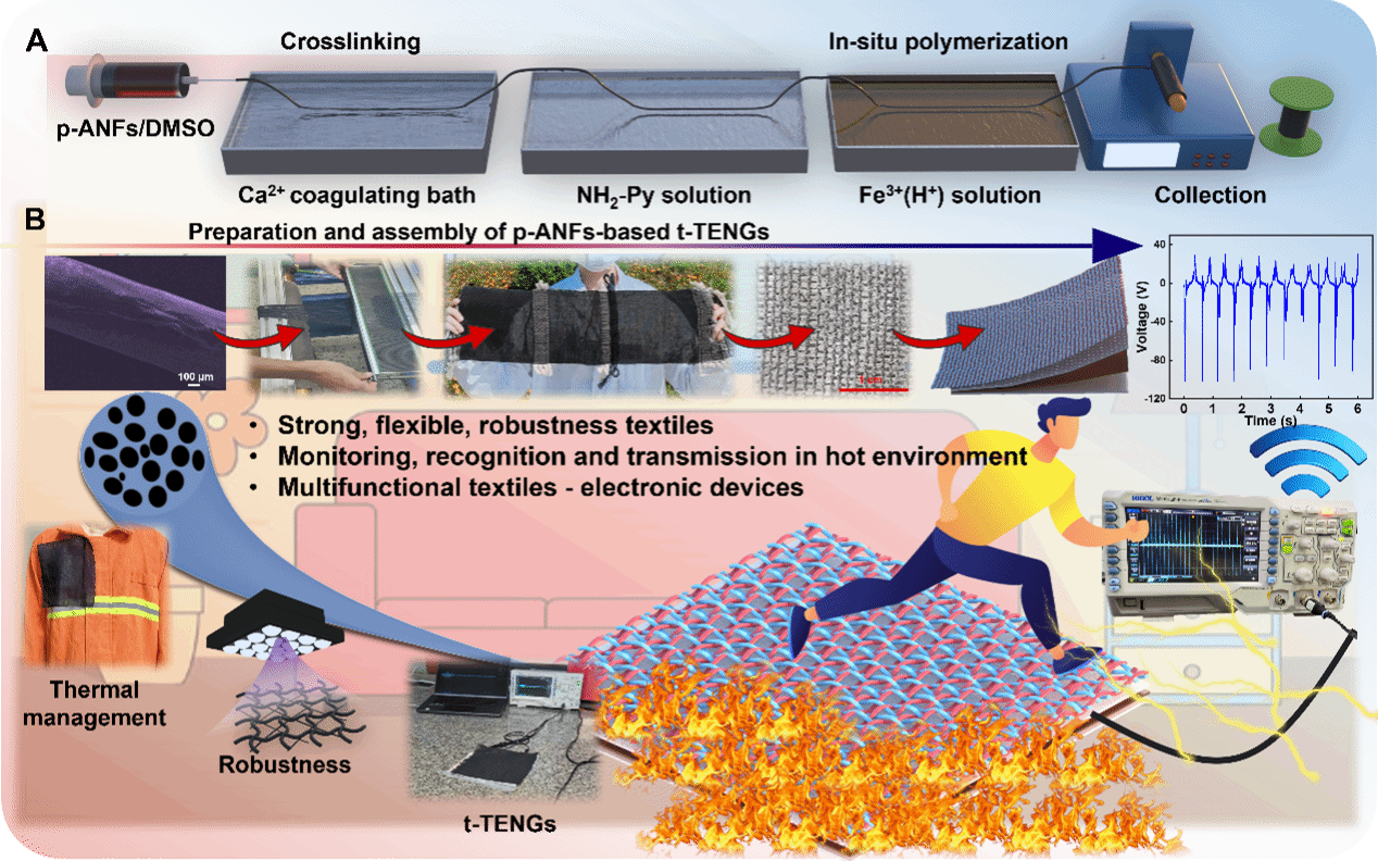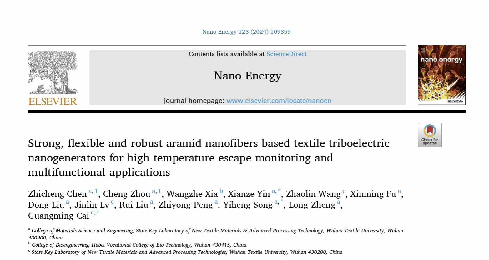 近日,伟德bv国际体育材料科学与工程学院宋毅恒博士、纺织科学与工程学院蔡光明教授在国际知名学术期刊《Nano Energy》发表题为“Strong, flexible and robust aramid nanofibers-based textile-triboelectric nanogenerators for high temperature escape monitoring and multifunctional applications”的高水平论文(链接:https://authors.elsevier.com/a/1iZcQ7soS89x4l)。材料学院殷先泽教授、宋毅恒博士、纺织学院蔡光明教授为共同通讯作者。伟德bv国际体育材料学院2022级硕士研究生陈之诚、2022级本科生周成为共同第一作者。
