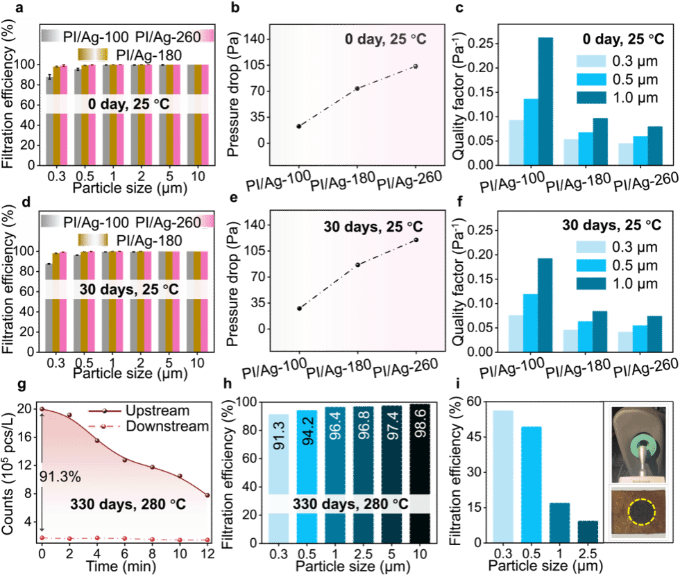 通过对聚酰亚胺及其银纳米粒子复合后的纤维毡形貌和物化性质进行分析,表明原位生长法可成功将银纳米粒子附着在聚酰亚胺纤维毡上。在30-350 °C热解温度范围内,聚酰亚胺/银纳米粒子纤维毡(PI/Ag)的重量损失不超过5%;耐热性测试表明,PI/Ag经280 ℃长时间热处理后纤维仍可保持连续形态,且纤维直径没有发生明显变化。PI/Ag的优异热稳定性使得基于该材料的空气过滤器能够在200-300 °C 的环境温度下长期使用。