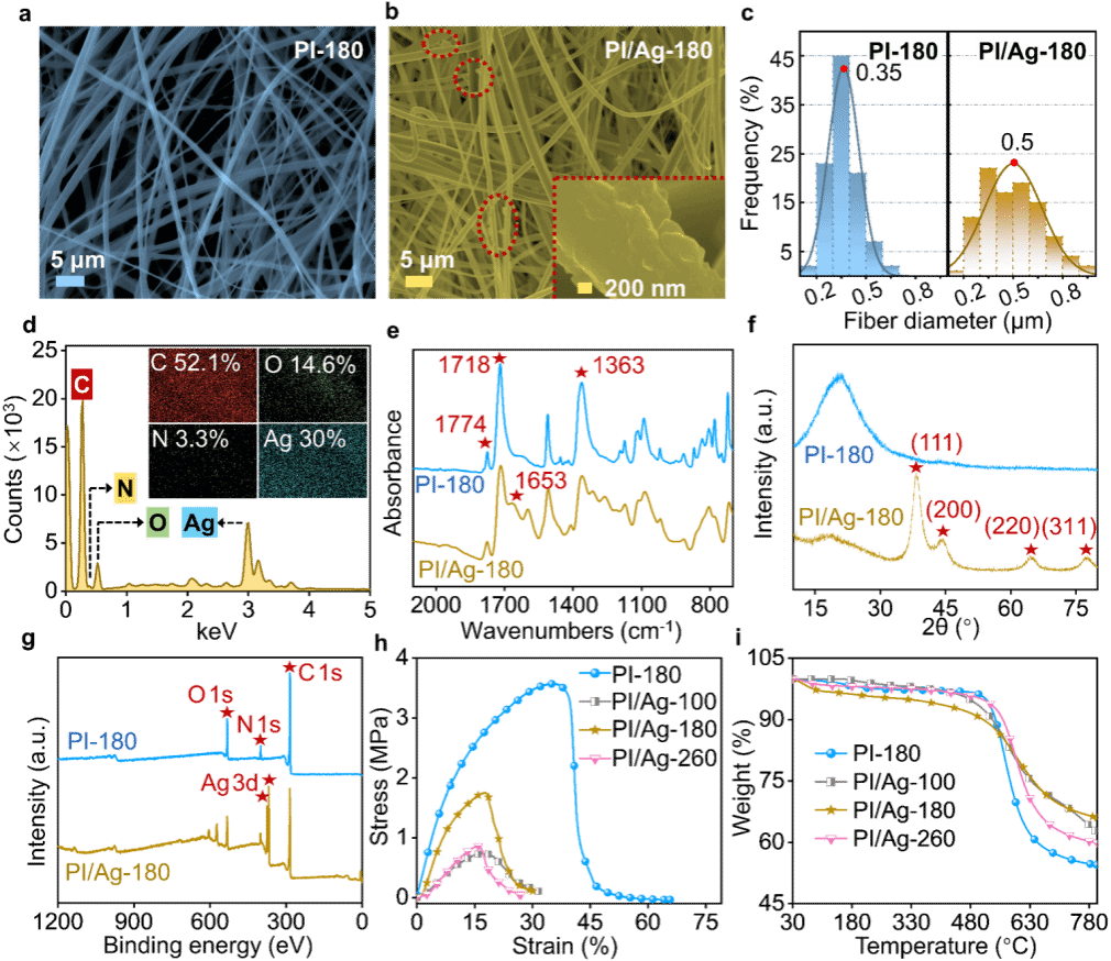 图2. 聚酰亚胺及其银纳米粒子复合纤维毡的形貌和物化性质分析
