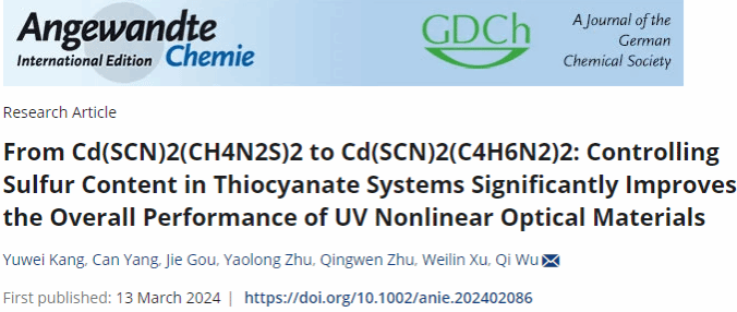针对上述问题,本论文在已经合成的中心对称结构 Cd(SCN)2(CH4N2S)2 的基础上,通过降低其中的 S 含量,合成了一个具有非中心对称结构的硫氰酸盐 Cd(SCN)2(C4H6N2)2。与 Cd(SCN)2(CH4N2S)2 相反,Cd(SCN)2(C4H6N2)2 实现了二次谐波(SHG) 响应从惰性到高达 10 倍 KDP 的显著转变。同时,它的双折射率降低到 0.17@546 nm,适度的双折射确保了相位匹配的实现。更引人注目的是,其紫外截止边(234 nm)延伸到了短波紫外区,光学带隙高达 4.74 eV,这表明 Cd(SCN)2(C4H6N2)2 是一种潜在的优秀紫外非线性光学晶体材料,这也是硫氰酸盐实现相匹配短波紫外非中心对称结构的首个实例。该研究表明,调节中心对称硫氰酸盐内部 S 的含量是开发综合性能优异的短波紫外非线性光学晶体材料的有效策略,为探索具有先进 NLO 性能的新型非中心对称结构晶体材料开辟了新途径。