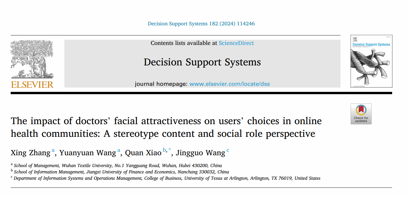 近日,信息管理领域国际权威期刊《Decision Support Systems》发表了伟德bv国际体育管理学院张星教授作为第一作者撰写的论文《The impact of doctors’ facial attractiveness on users’ choices in online health communities: A stereotype content and social role perspective》(医生面部吸引力对在线健康社区用户选择的影响:一种刻板印象内容和社会角色视角)。伟德bv国际体育为论文第一单位,伟德bv国际体育管理学院硕士研究生王圆圆、江西财经大学肖泉教授和美国得克萨斯州大学阿灵顿分校汪静国教授是论文的共同作者。