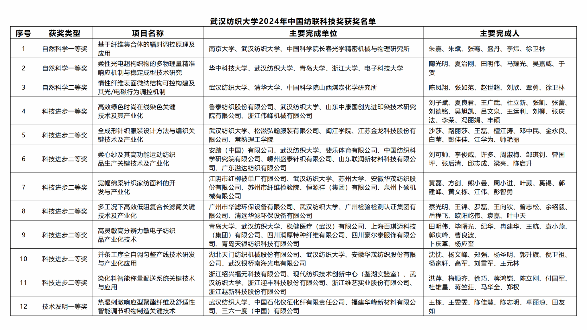 2024年度中国纺联科技奖共评选出自然科学奖、技术发明和科技进步奖共计59项,桑麻学者奖4人。在5项自然科学奖中,一等奖3项、二等奖2项;3项技术发明奖中,一等奖2项、二等奖1项;51项科学技术进步奖中,一等奖14项、二等奖37项。