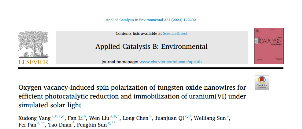 11月29日,环境和催化领域的顶级期刊《应用催化B:环境》(Applied Catalysis B: Environment)(IF=24.319)上在线发表了伟德bv国际体育潘飞教授和北京大学刘文研究员团队在缺陷型高效光催化纳米线材料的研究取得的重要进展-“Oxygen vacancy-induced spin polarization of tungsten oxide nanowires for efficient photocatalytic reduction and immobilization of uranium(VI) under simulated solar light”,文章DOI:https://doi.org/10.1016/j.apcatb.2022.122202。伟德bv国际体育为该论文的第一署名单位,通讯作者为伟德bv国际体育环境工程学院潘飞教授和伟德bv国际体育“阳光讲席教授”刘文研究员。
