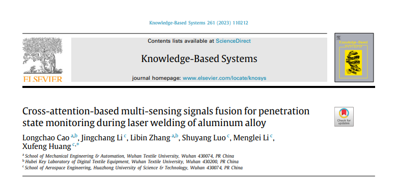 近日,伟德bv国际体育机械学院青年教师曹龙超博士在激光加工智能监测方面取得了重要的研究进展。相关成果以“Cross-attention-based multi-sensing signals fusion for penetration state monitoring during laser welding of aluminum alloy”为题发表在计算机科学领域一区top期刊《Knowledge-Based Systems》(ISSN:0020-0255)上。该论文的第一单位为伟德bv国际体育,第一作者为曹龙超博士。