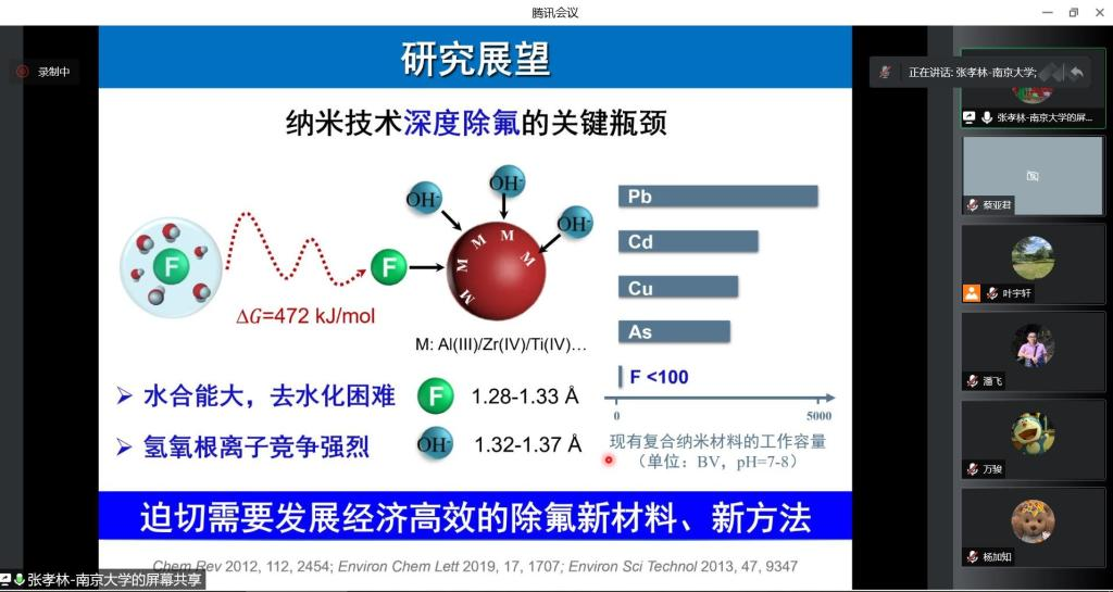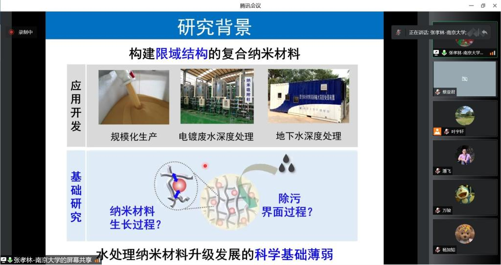 张孝林副教授首先分析了我国地下水和工业废水中砷氟污染现状,详细总结了该类水体的处理手段及难点。在谈到砷氟水体处理现存的问题时,他提出开发新型水处理功能材料是十分必要的,现有的复合纳米材料存在三方面的挑战,即纳米颗粒限域生长过程难以有效调控、纳米颗粒与污染物的限域作用特性不清以及共存基质对纳米材料深度除污过程干扰强烈。针对以上挑战,张孝林副教授课题组开发了一系列限域纳米材料,深入探究其除砷氟的限域特性及机制,构建功能耦合的抗干扰策略,最终实现了水体砷氟污染物的深度去除。该项研究已成功用于实际地下水和工业废水的处理,实现了一定规模的工程化应用。张孝林副教授还结合前期的研究,分享了未来即将开展的研究规划,为我院师生拓展研究思路、开阔学术视野提供了帮助。报告结束后,参会师生针对讲座内容进行踊跃提问,张效林副教授对这些问题进行了细致解答。